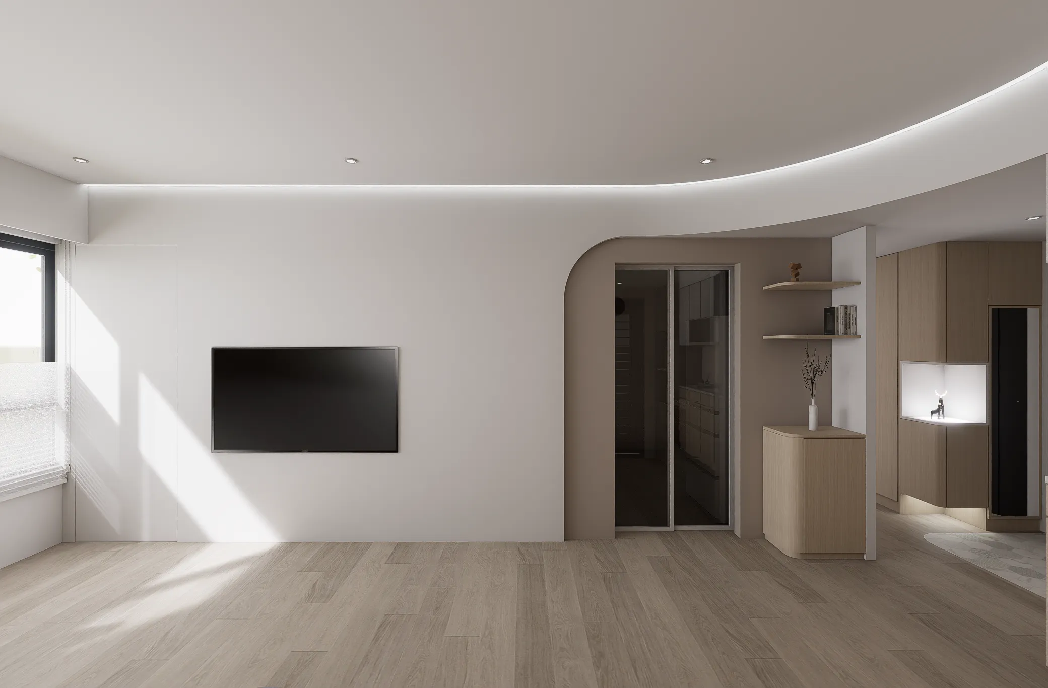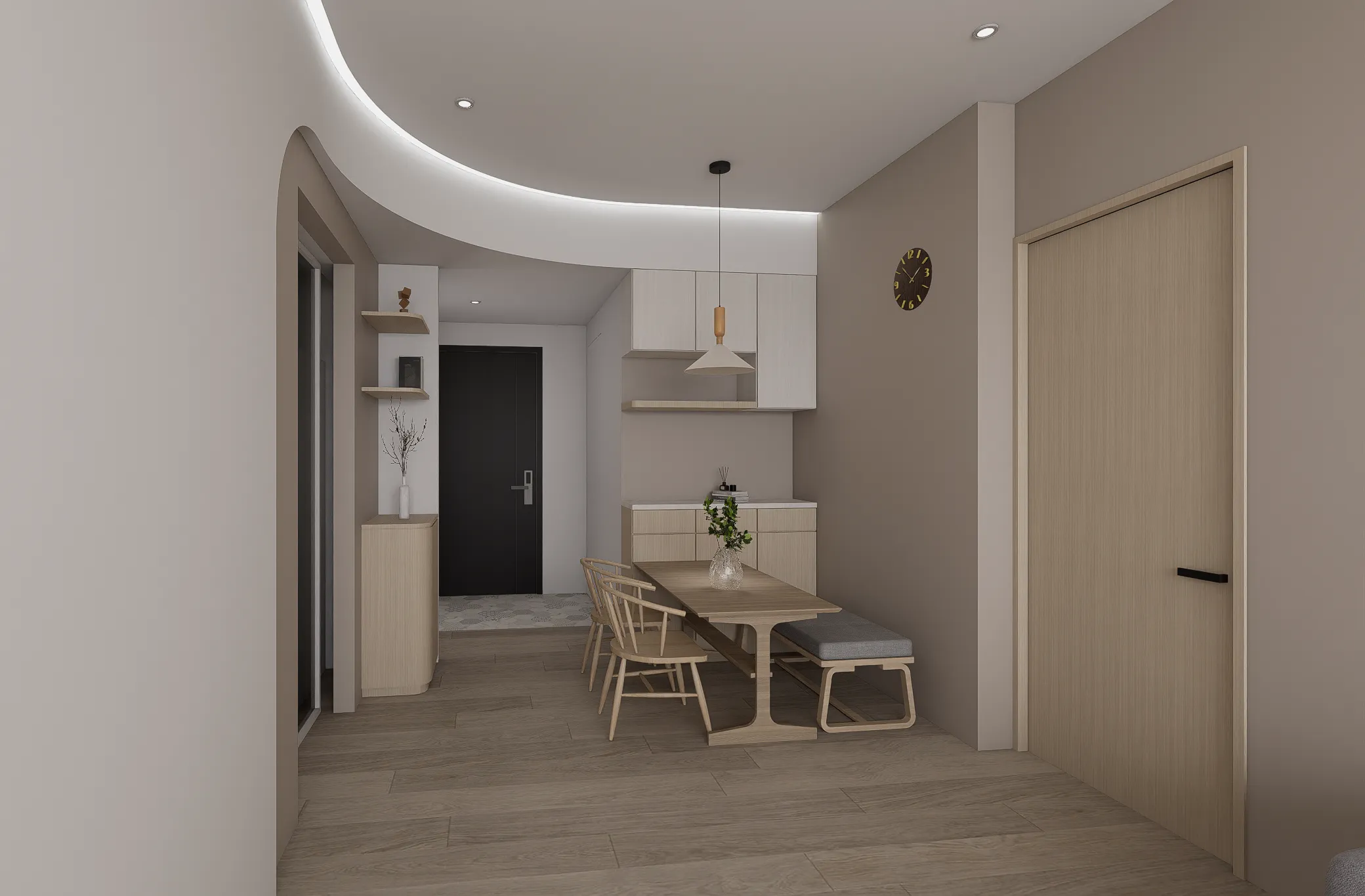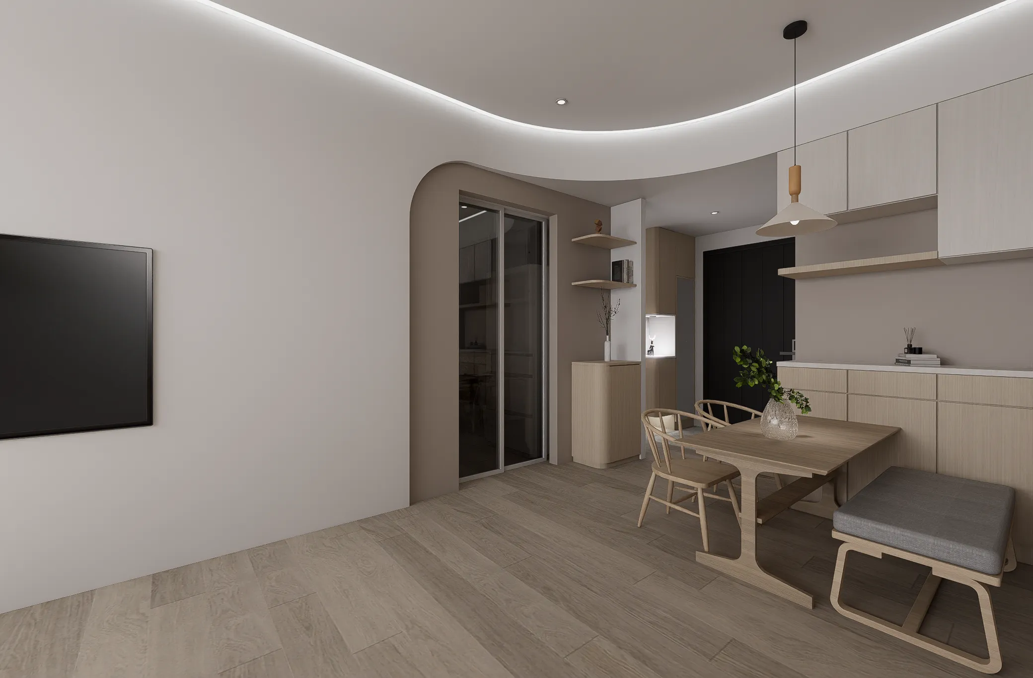 機 能 ︱ 住宅 型 態 ︱ 新成屋 坪 數 ︱ 20坪風 格 ︱ 北歐 x 日系 語 彙 ︱ 曲面弧牆、原木飾面、間接照明、奶茶色∷家的歸屬感,是目之所及的溫暖,在自然的基調中,心找到了最安穩的落點。弧形牆面輕柔轉折,模糊了界線,牽引著步伐,走向一處靜好的所在。大面積的間接照明溫和灑落,光成為最無聲的陪伴;木質的溫度與肌理,輕輕接住心的重量在這裡,每一個細節都回應生活的本質, 時間慢了下來,只留下安定與自在。