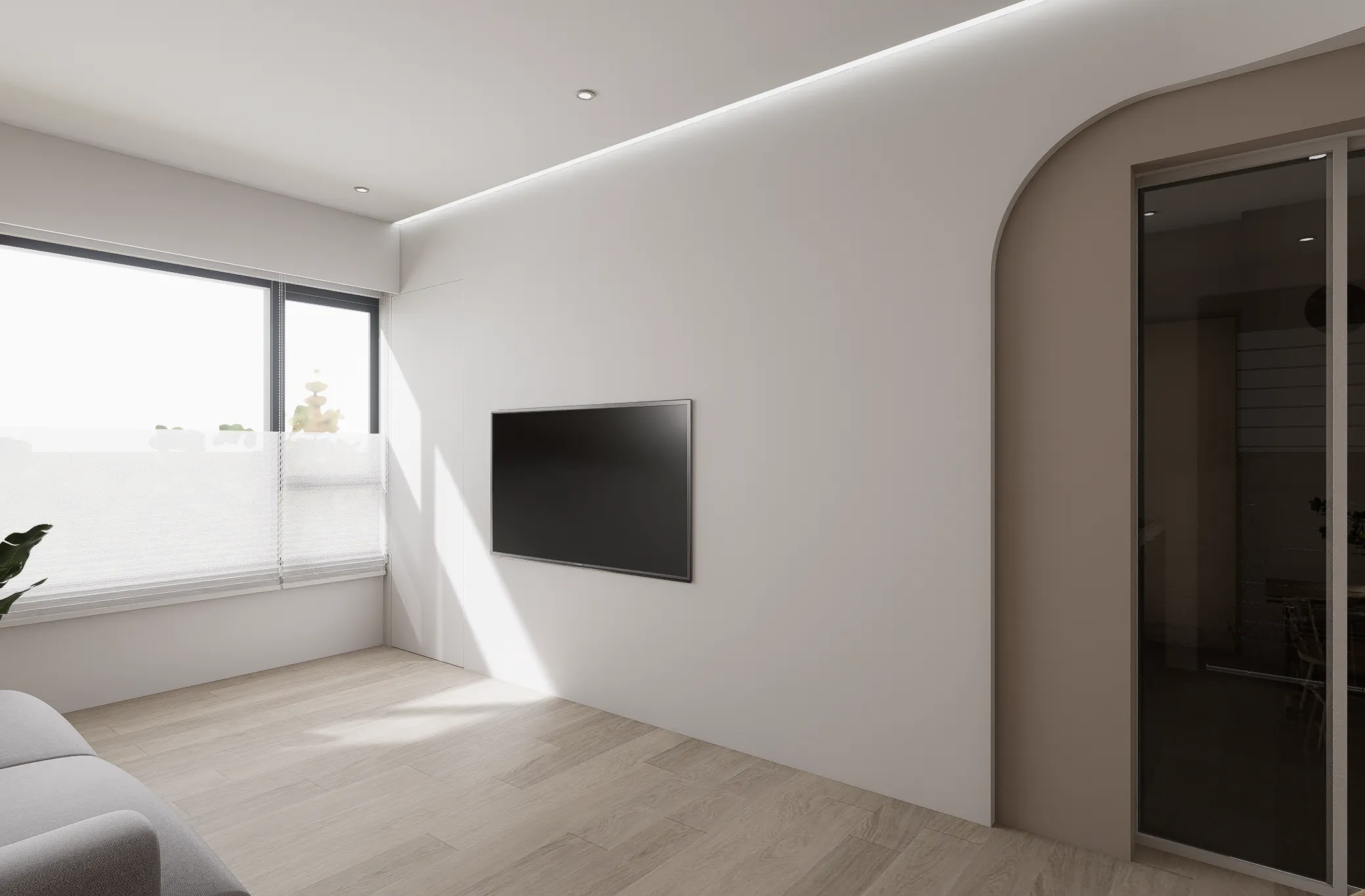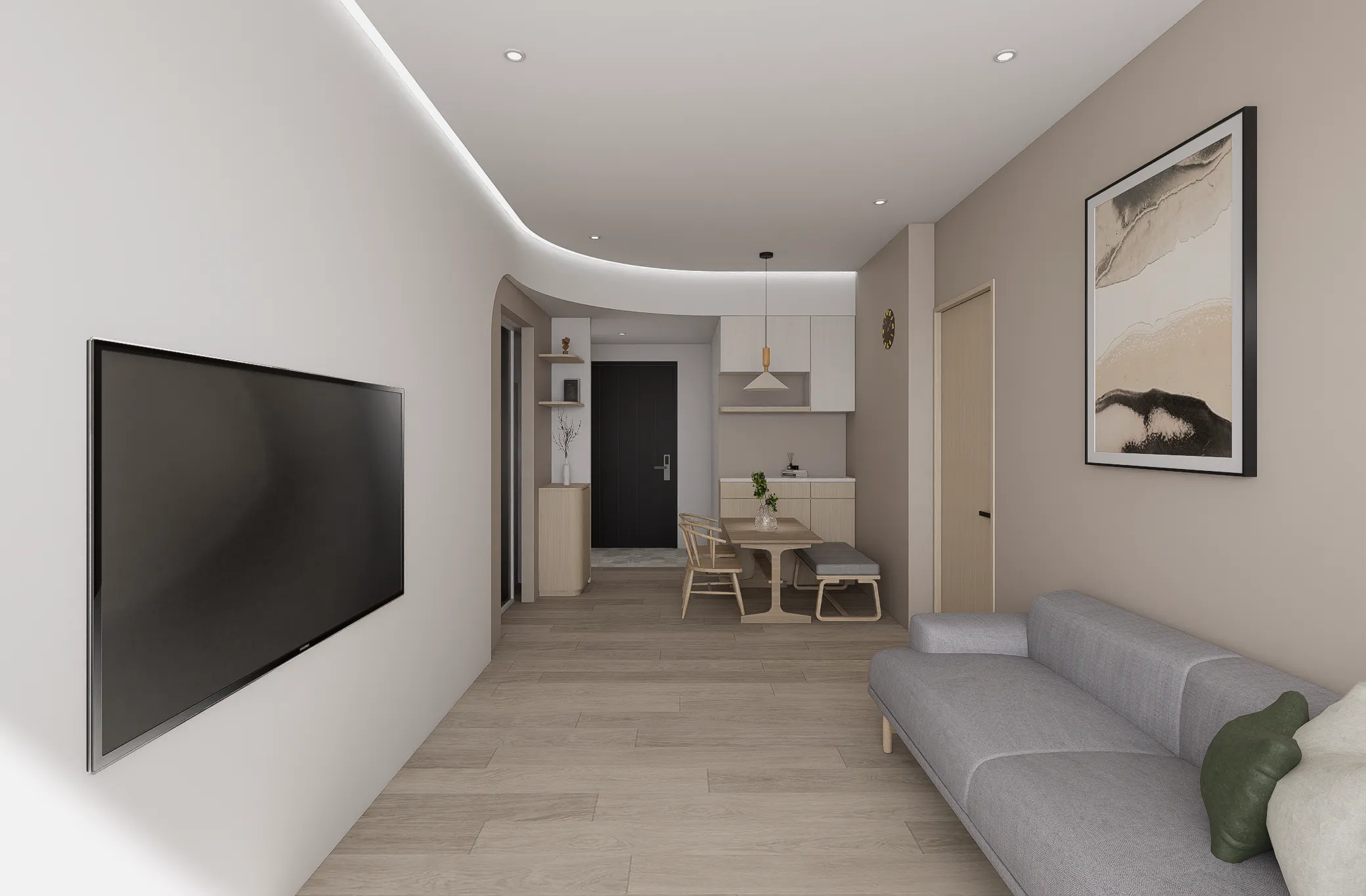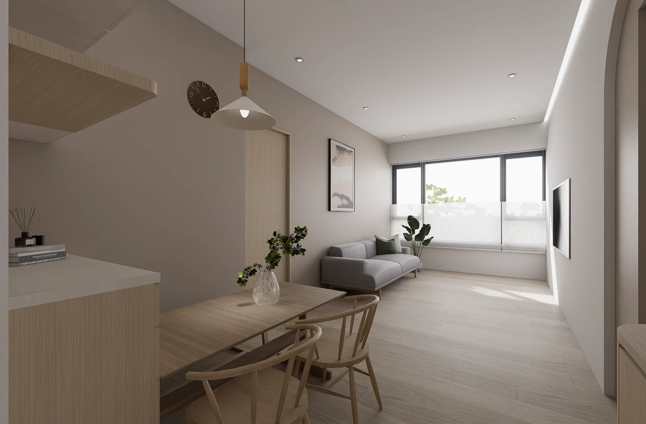 機 能 ︱ 住宅 型 態 ︱ 新成屋 坪 數 ︱ 20坪風 格 ︱ 北歐 x 日系 語 彙 ︱ 曲面弧牆、原木飾面、間接照明、奶茶色∷家的歸屬感,是目之所及的溫暖,在自然的基調中,心找到了最安穩的落點。弧形牆面輕柔轉折,模糊了界線,牽引著步伐,走向一處靜好的所在。大面積的間接照明溫和灑落,光成為最無聲的陪伴;木質的溫度與肌理,輕輕接住心的重量在這裡,每一個細節都回應生活的本質, 時間慢了下來,只留下安定與自在。