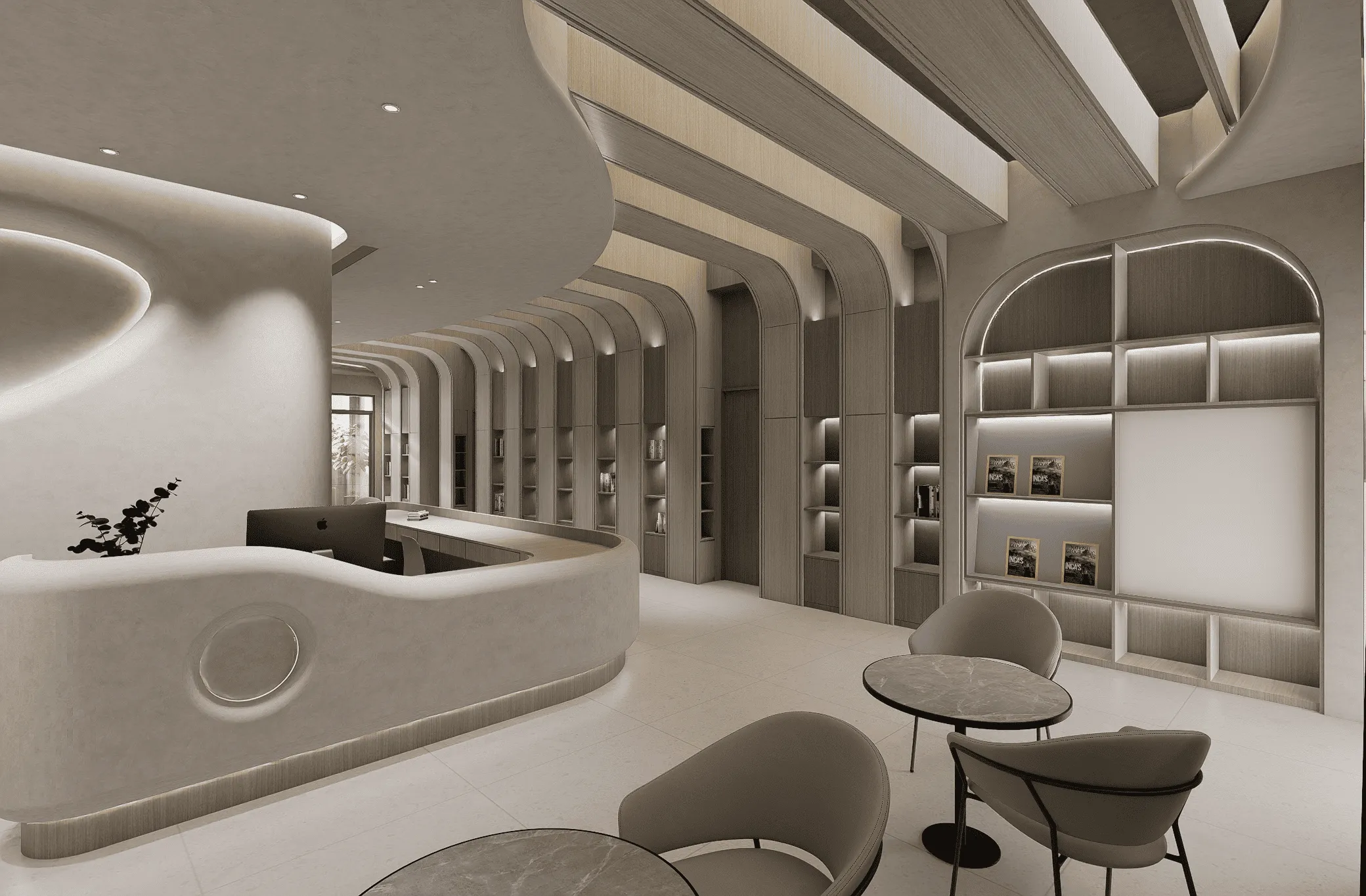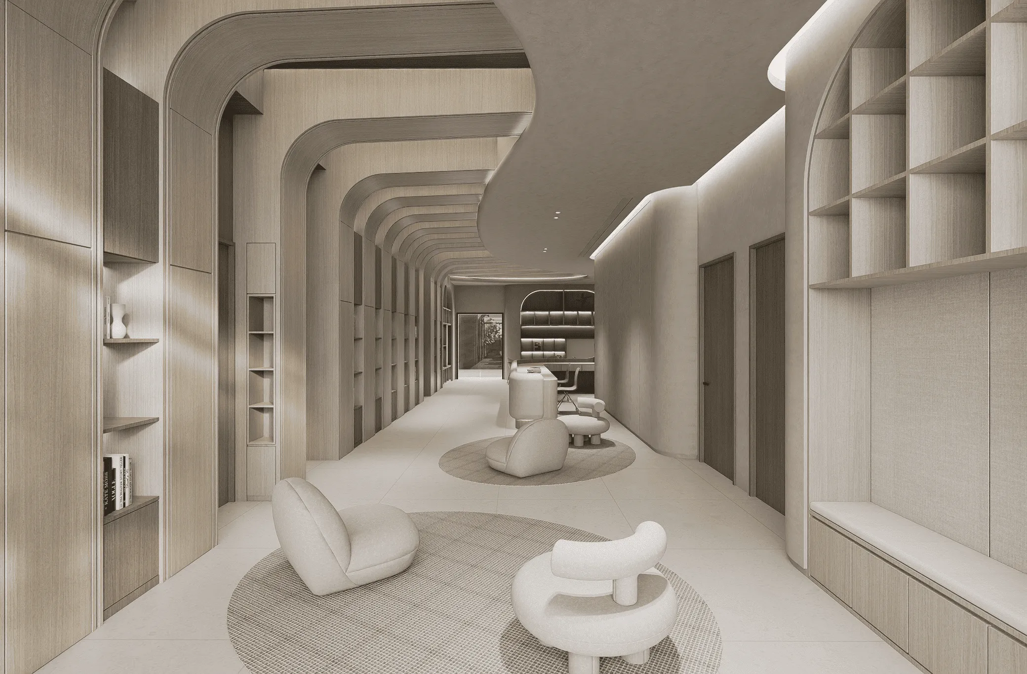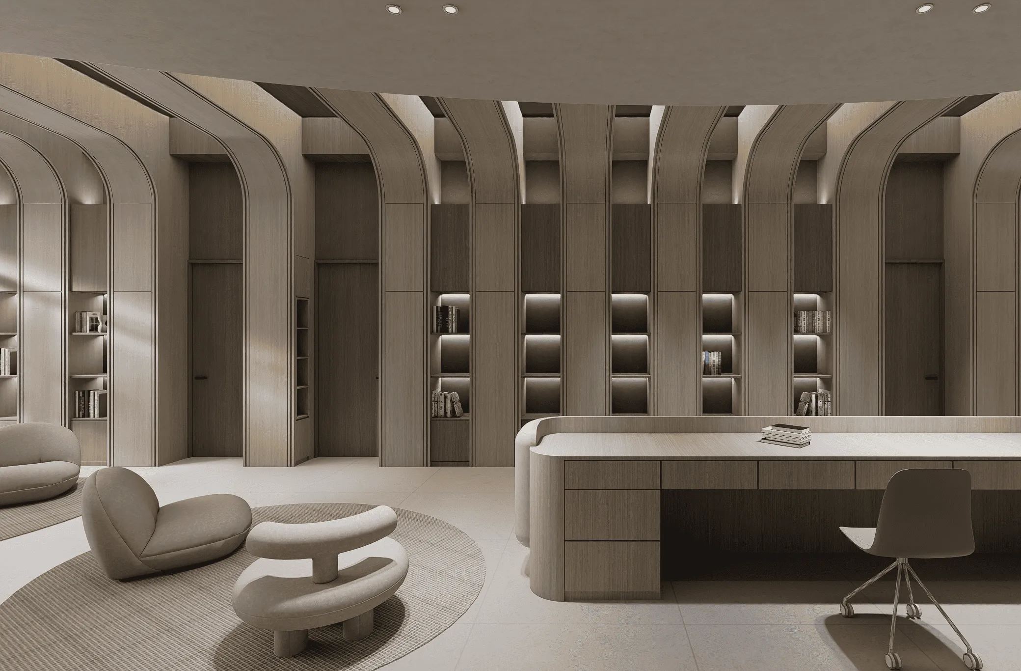 語 彙 ︱ 弧形立面、淺木紋飾面、拱形框架、光帶設計