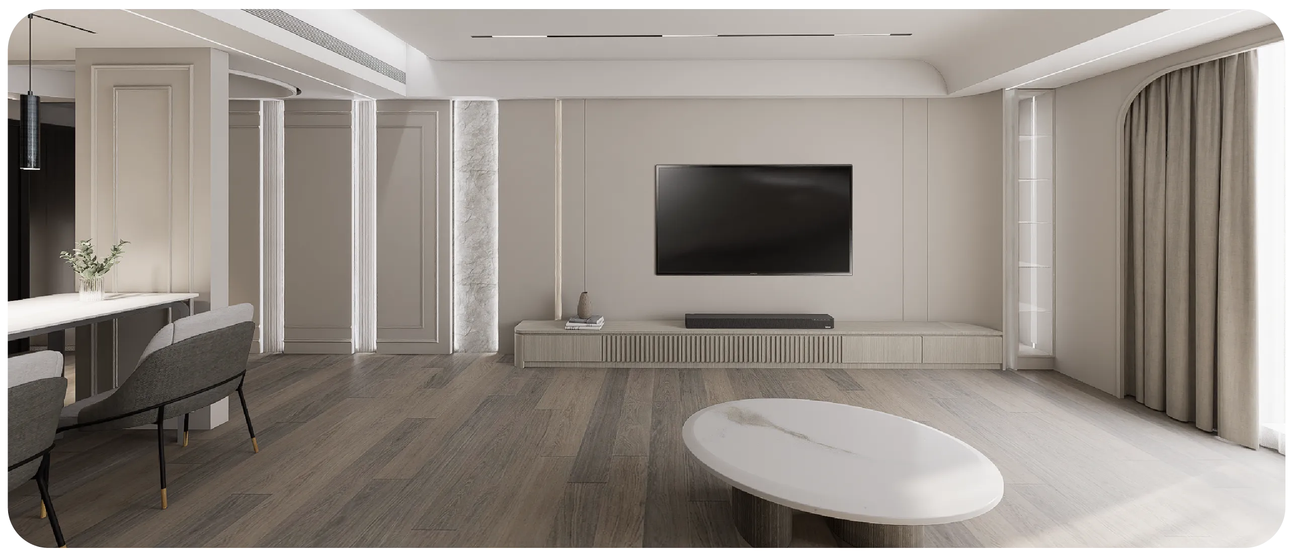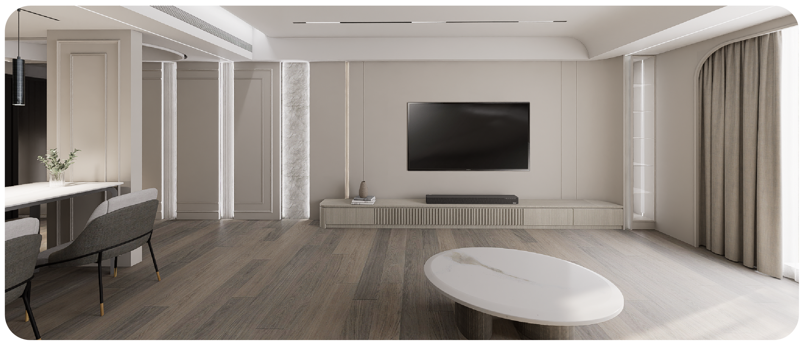 ▪️大坪數(面寬 > 350cm): 可施作隱藏式收納櫃,深度控制在 35-45cm 內,並利用「二八原則」留出開放展示區,打破厚重感。