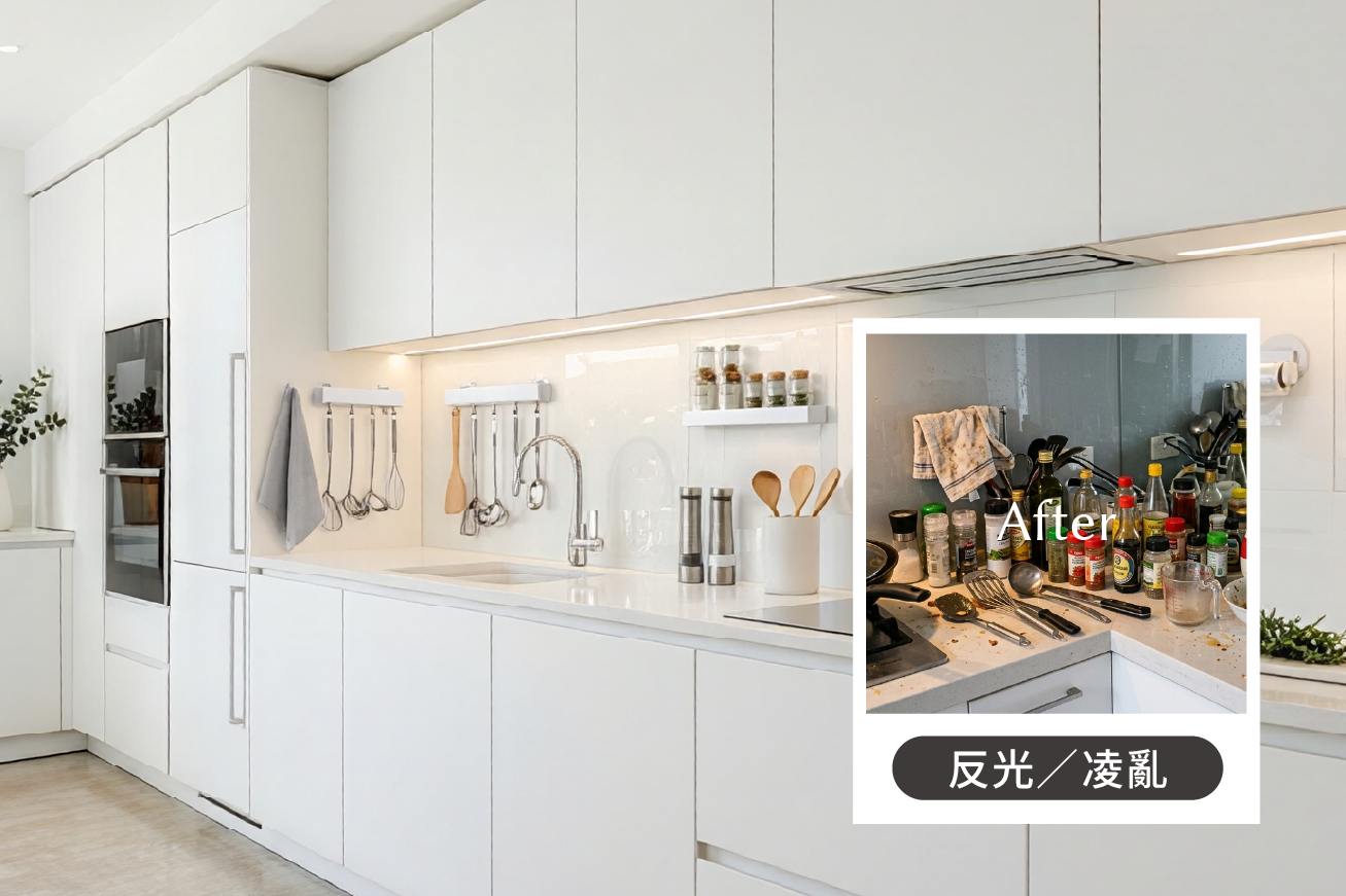 許多屋主選用烤漆玻璃是看中其「表面光滑好清理」特性,但誤以為其具備磁吸功能可以掛置物件。實際上,烤漆玻璃本質完全無磁力,導致入住後發現無法利用牆面收納,只能將調味料與廚具堆放於檯面,造成視覺凌亂。