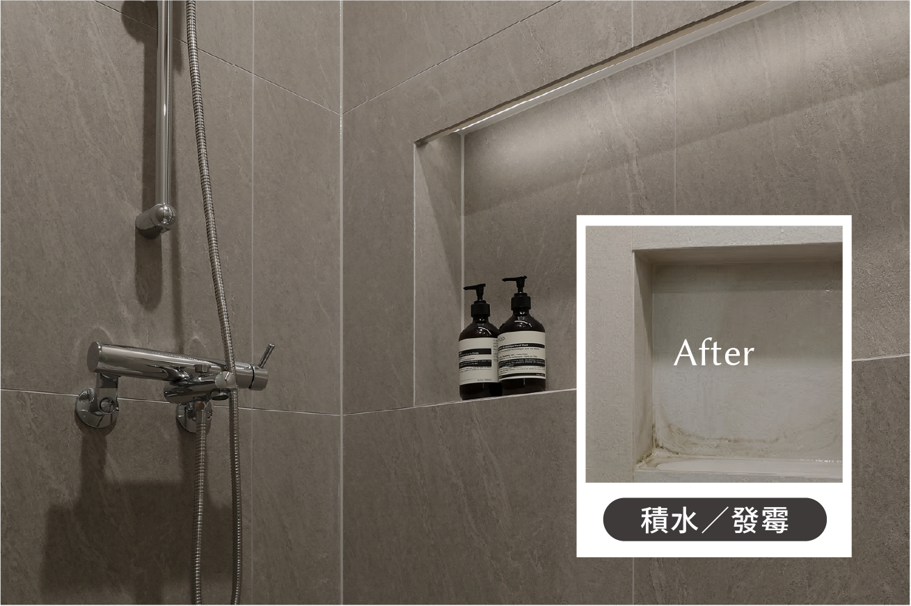 壁龕需犧牲牆體深度,若為承重牆需額外增厚牆體,會縮小浴室空間。且若無抓好洩水坡度,積水會長期滯留於底部,導致瓶罐發霉、磁磚縫隙變黑。