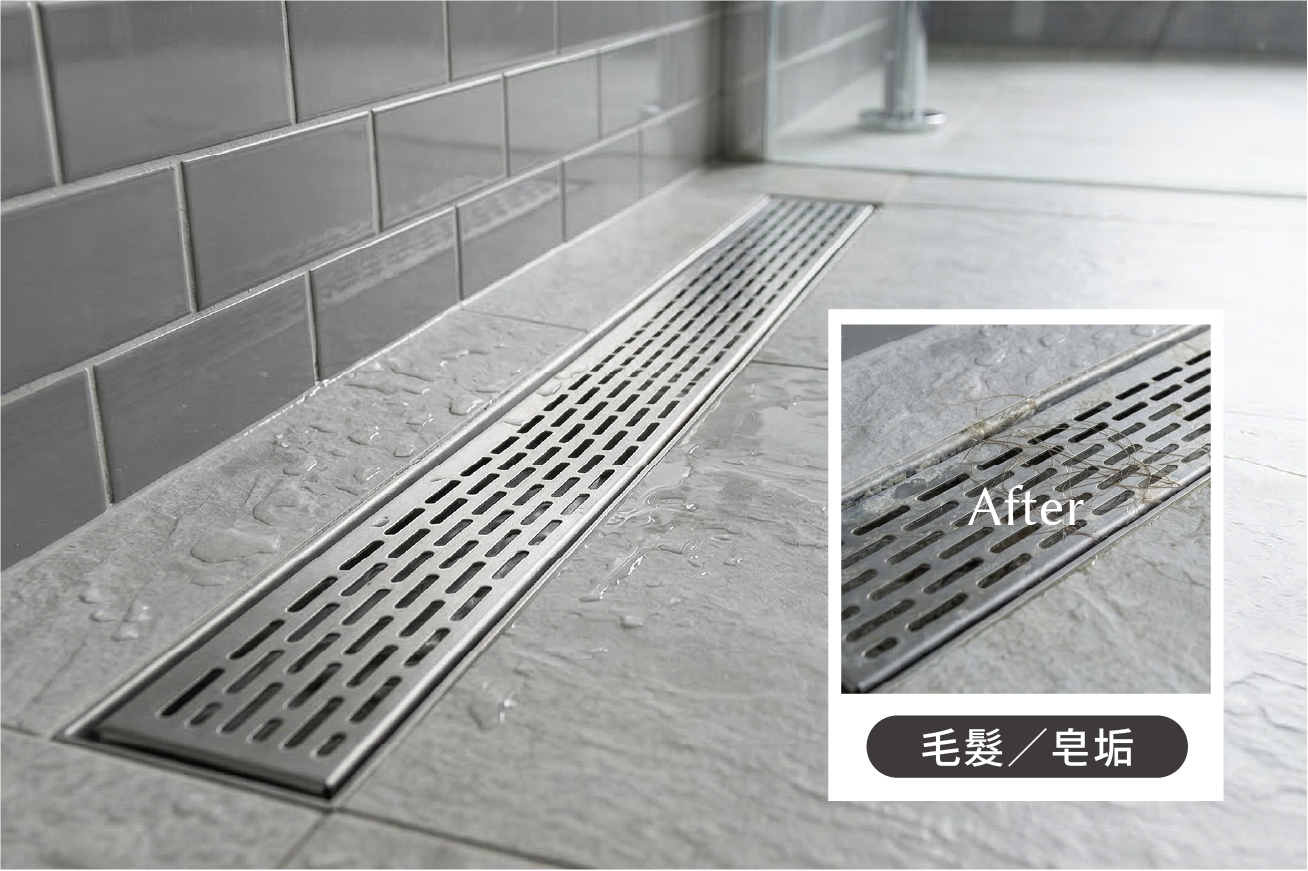 ☛ 長型排水溝: 使用便利的同時,也需建立定期清潔的習慣。