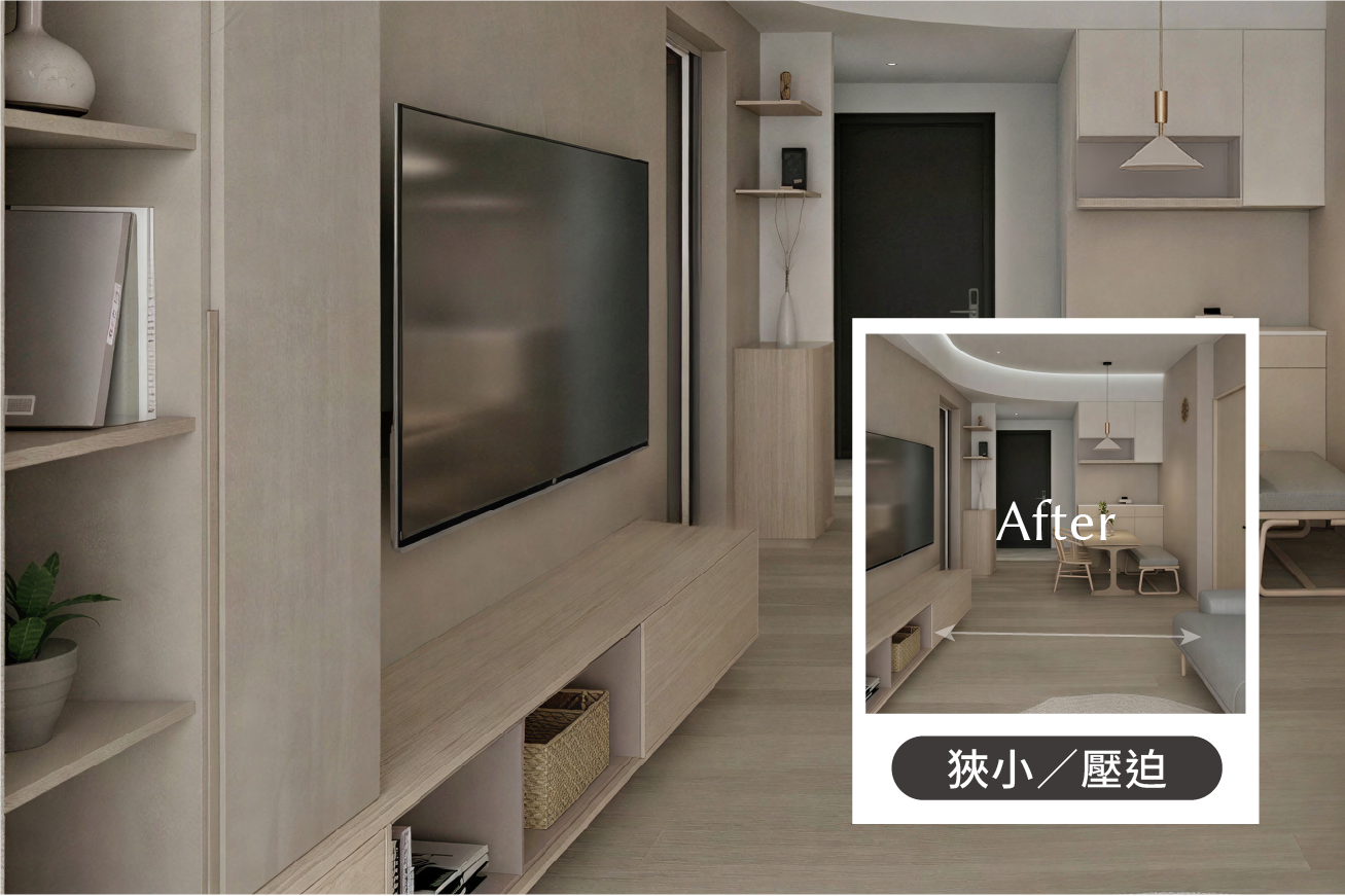 A:若深度不足(面寬 < 3m),建議捨棄電視牆收納,改將收納需求規劃在側牆或樑下空間,客廳才不會顯得擁擠。